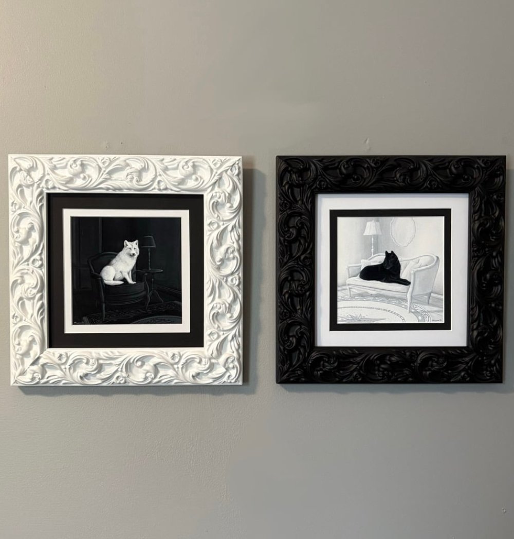 These paintings feature the white arctic wolf and the black wolf in rooms contrasting their natural colouring, to emphasize their beauty.